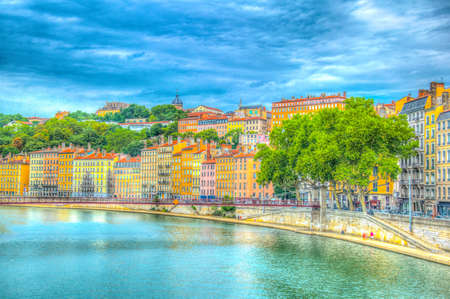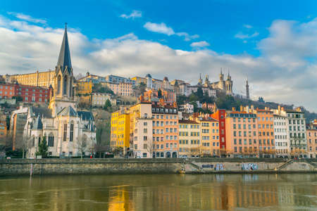 Lyon cityscape from Saone river with colorful houses and river, France, Europe