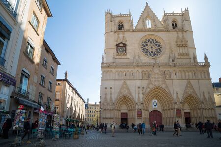 Lyon, France - March 26, 2016: The Saint Jean Cathedral and the Saint Jean square, located in the old town of Lyon.