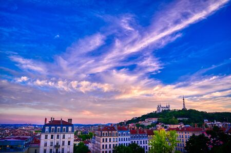 Lyon, France and the Basilica of Notre-Dame de Fourvière at sunset.