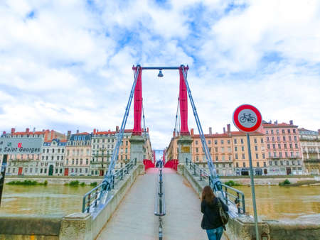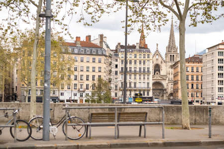 LYON, FRANCE-APRIL 7, 2919: Embankment of the River Saone on the bridge in the city of Lyon.