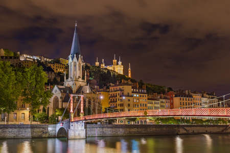 Church of Saint Georges and footbridge, Lyon, France. Panoramic view of Saint Georges church and pedestrian footbridge across Saone river, Old town with Fourviere cathedral..