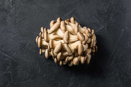 Raw brown shimiji shimeji mushrooms on black background top view. Hypsizygus tessulatus mushroom native to East Asia. Cooking preparing vegetarian vegan healthy food. Beech mushroom wallpaper.