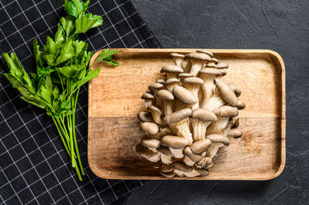 Delicious organic oyster mushrooms with fresh parsley. Source of beta glucan, black stone concrete background, copy space
