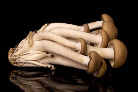 Lot of whole shimeji brown mushroom cluster isolated on black glass