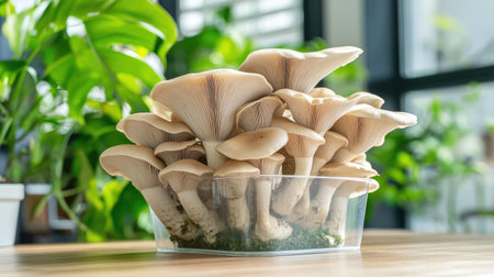 A close-up view of freshly harvested oyster mushrooms presented in a clear plastic container, set against a backdrop of lush indoor plants on a wooden table.
