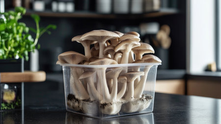 A tranquil kitchen scene featuring freshly harvested mushrooms displayed in a transparent container, accentuated by lush green plants in the background.