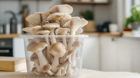 A transparent container filled with fresh organic mushrooms sits on a wooden table in a modern kitchen. The light creates a vibrant, healthy scene perfect for culinary inspirations.
