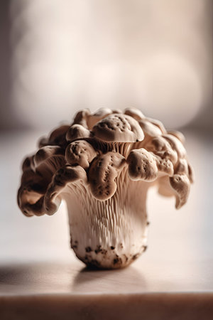 A close-up of fresh mushrooms on a wooden cutting board, showcasing their unique shape and texture, ready for cooking.