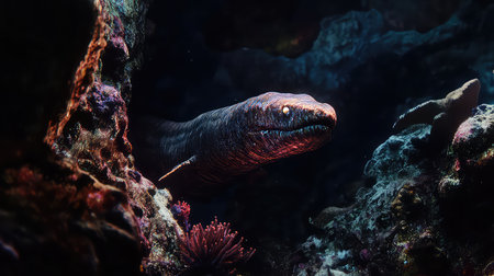 A stunning depiction of a deep-sea creature moving gracefully through a vibrant coral reef, illustrating the enchanting beauty of underwater ecosystems.