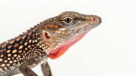 green anole lizard displays its colorful pink dewlap while perched on a white background. The image highlights the intricate details of its scales and features in bright lighting.