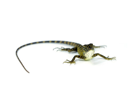 Close-up of australian water dragon on its habitat on land. Beautiful tuatara in zoo or terrarium. Exotic tropical animals concept.