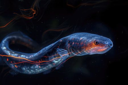 Blue and Orange Fish With Long Tail Swimming in Clear Water, A surreal vision of an Electric Eel generating streaks of electricity in the dark, AI Generated