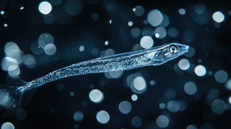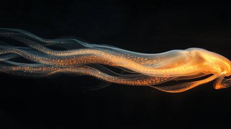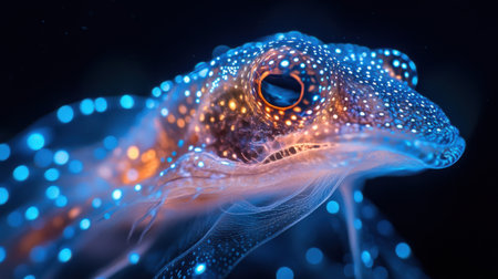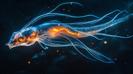 deep-sea creature swimming in the darkness of the deep, its bioluminescent lights shining, created with generative ai