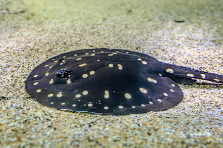 Stingray motoro, Potamotrygon motoro in an aquarium on sandy bottom. Freshwater river spotted brown stingray peacock lying in aquarium pool, close up. Wild animal, zoology, aquatic creature