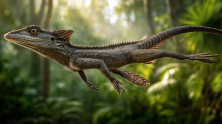 A flying dragon Draco volans gliding gracefully between trees in a tropical forest, showcasing its vibrant colors, extended wing-like ribs, and natural habitat.