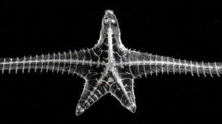 A detailed, high-contrast image presents a translucent starfish against a dark backdrop. The skeletal structure is clearly visible, revealing intricate internal features. The monochrome style creates a scientific aesthetic, suitable for educational materials and potential use in biological studies or research publications.