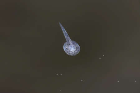 A tadpole of a yellow-bellied toad, Bombina variegata, in brown water.