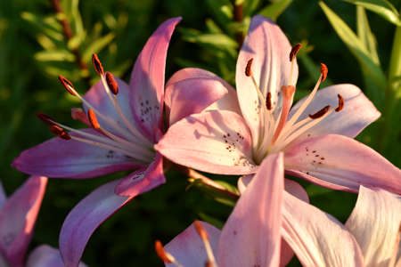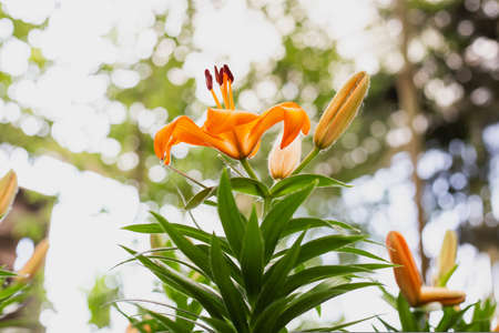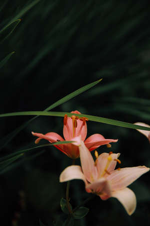 Lily flowers on a blurry background on a sunny June day in the countryside.