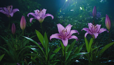 Elegant pink lilies in full bloom against a dark background, showcasing delicate petals and intricate details, perfect for nature and floral themes.