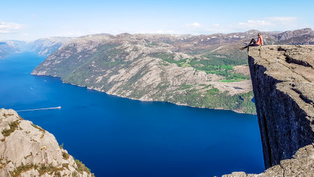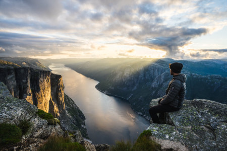 Man resting at the top of Pulpit Rock with a fjord at Preikestolen under beautiful norway landscape and nature, Pulpit Rock, Norway