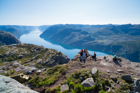 Stavanger, Norway - April 16, 2016: People standing at Preikestolen, the Pulpit Rock. Lysefjorden in the background.