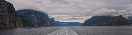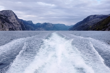 looking back on mountains and boat wake from a tourist boat in the Lysefjord Norway, near the Pulpit Rock