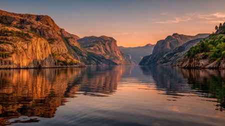 Majestic scene of serene mountains at sunset, with reflections shimmering in calm waters, showcasing the beauty of nature in a tranquil fiord setting. Perfect for travel.