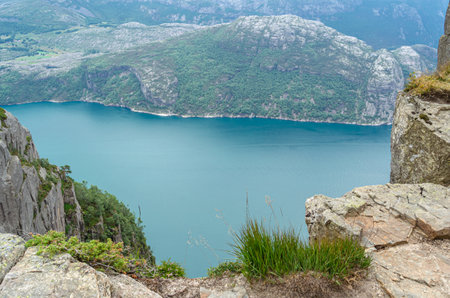 View of Lysefjorden fjord from Preikestolen (The Pulpit Rock), a tourist attraction in Rogaland county, Norway, a steep cliff which rises 604 meters above the fjord