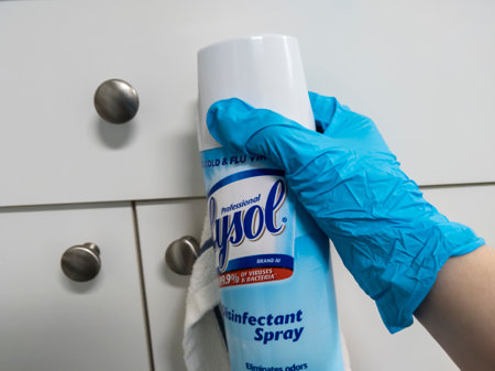 Seattle, WA USA - circa March 2020: Gloved hand holding a spray cannister of Lysol, aimed at a door handle indoors.