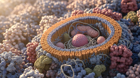 An artistic illustration showcases multiple biological cells, each featuring a layered orange core encapsulated within a translucent, blue-tinged membrane. The image utilizes a shallow depth of field, with soft focus on certain areas. Suitable for scientific publications, educational resources, or conceptual design projects.
