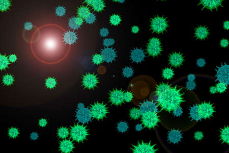 small virus covid 19 ball glow green blue was floating in air on black screen and light of len flare