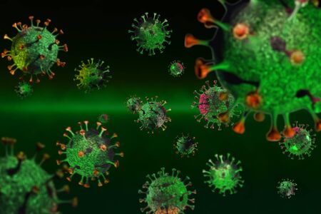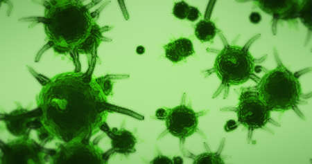 Conceptual 3d rendering of novel coronavirus 2019-nCov closeup under microscope on green background. Pandemic. contagion, healthcare and vaccine concepts