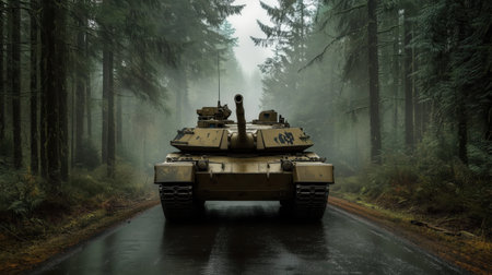 An imposing modern tank is captured facing the camera on a wet road amidst a dense, misty forest, highlighting a striking contrast between military technology and natural wilderness.
