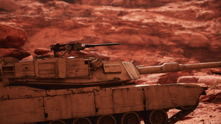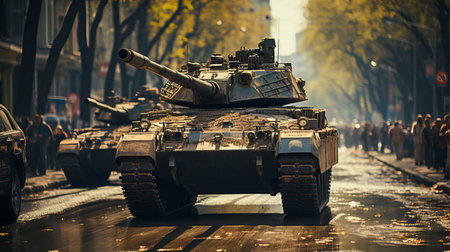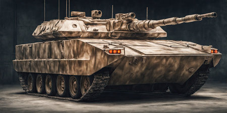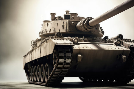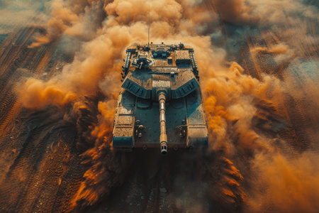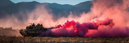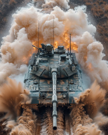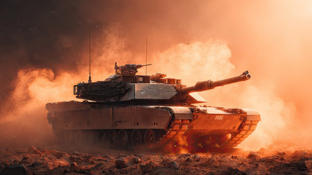 A military tank is featured prominently, set against a backdrop of smoke and dust. The image presents a visual representation of conflict, using warm colors to emphasize intensity. Suitable for editorial purposes, the artwork offers a symbolic depiction of combat and military hardware.