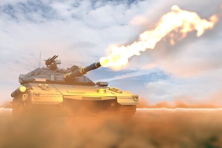 army tank with not existing design in fight shoots in desert, high resolution fire fight concept - military 3D Illustration