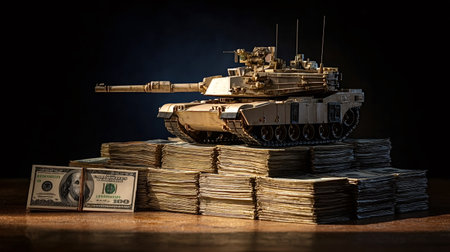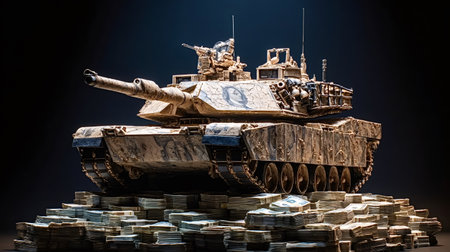 Military tank dominating a substantial pile of cash, illustrating the significant financial cost associated with war, defense budgets, and modern military operations globally