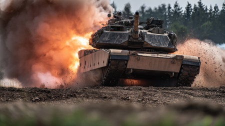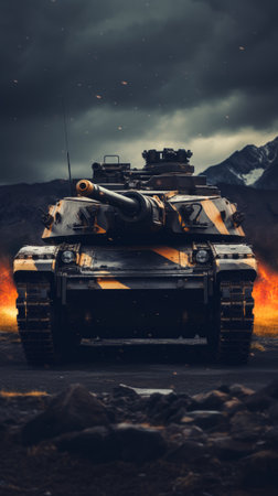 A military tank, the main subject, is featured against a backdrop of fire and smoke. The composition presents a dynamic view of potential combat or a destructive event. The image conveys a sense of conflict, and may be applicable for editorial and commercial use, such as illustrations and stock photography.