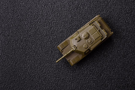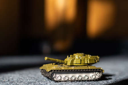Toy tank with camouflage color. Military vehicles toy. Simple cheap toys for children, warfare, warzone vehicles