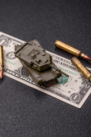 Military tank model resting on numerous stacks of one hundred us dollar banknotes, representing the high costs of war, military spending, defense budgets, and financial power in global conflicts