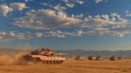 Military tanks advance across a desert landscape under a partially cloudy blue sky. The vehicles, in a muted color scheme, are depicted with their turrets visible and soldiers inside. The composition features a wide perspective with open space suggesting potential for commercial and illustrative purposes.
