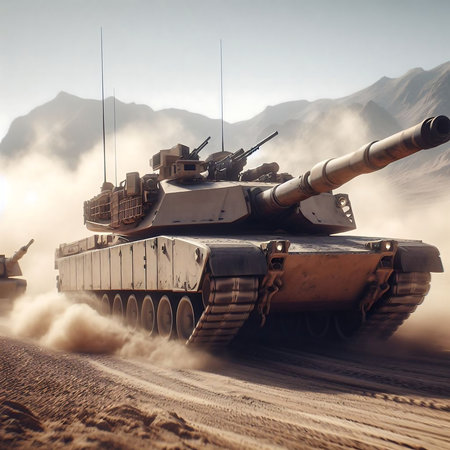 A military tank moves swiftly through a dusty landscape, creating a dramatic scene against a backdrop of dark clouds. Perfect for themes of strength and conflict.
