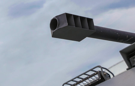 Close-up of the muzzle of a tank gun. A fragment of a cannon and a lantern in front of the tank.