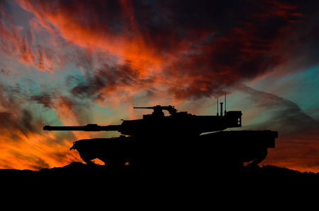 War Concept. Armored vehicle silhouette fighting scene on war fog sky background. American tank at sunset. Creative decoration