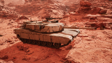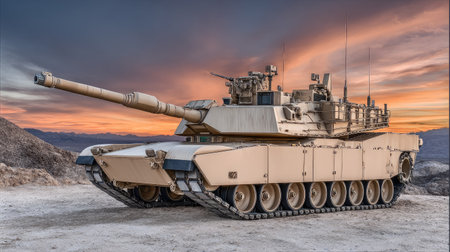 A military tank is positioned on a slightly elevated surface, its tan and black structure contrasting against a colorful sunset. The image displays a detailed view of the vehicle, emphasizing its mechanical components. The outdoor setting suggests a desert environment with mountainous features in the background, suitable for various editorial and commercial projects.
