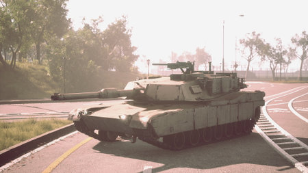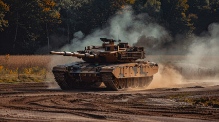 A military tank is shown traversing a desert environment. The image displays the vehicle's details and movement, with a focus on its design. The scene is illuminated by a warm sunset, creating a dynamic visual with potential uses in editorial or commercial projects.
