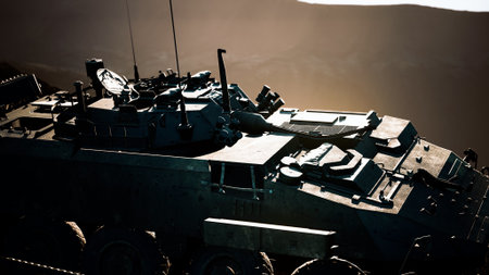 Military patrol car on sunset background. Army war concept. Silhouette of armored vehicle with gun in action. Decorated. Selective focus