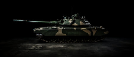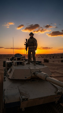 A powerful military tank is silhouetted against the dramatic colors of a fiery sunset. The imposing form of the armored vehicle stands starkly on the horizon, evoking themes of conflict, power, and the end of a long day on the battlefield.