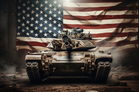 A military tank on the background of the American flag, American dollar bills. Concept: military and financial assistance to Ukraine, high arms costs, arms supplies from America.