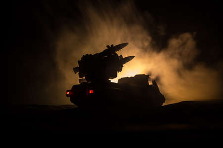 War concept. Battle scene with rocket launcher aimed at gloomy sky at night. Rocket vehicle ready to attack on cloudy war Background. Selective focus