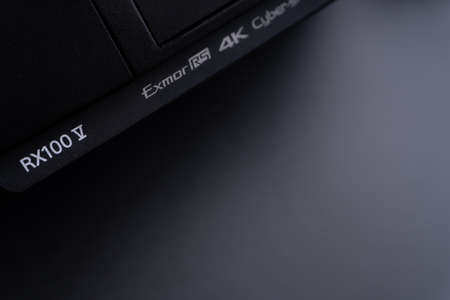 Kuala Lumpur, Malaysia - June 3,2021 : Sony compact or mirrorless camera closeup on black background. Selective focus and crop fragment